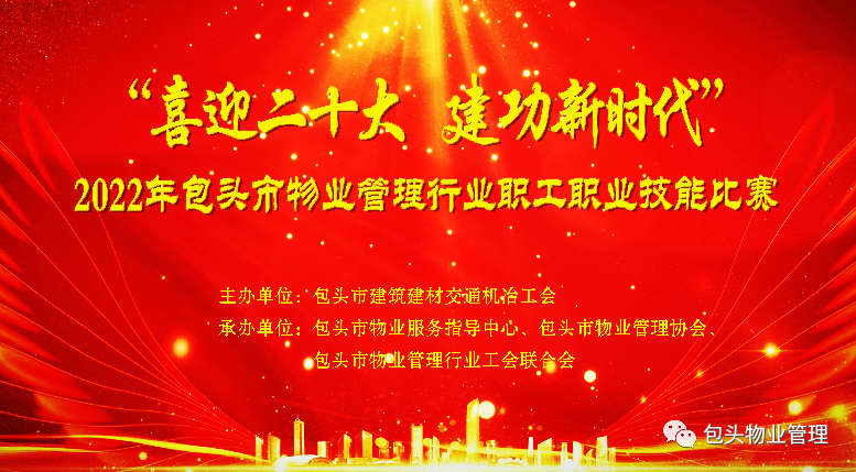 按照包头市总工会、包头市人力资源和社会保障局《关于开展“喜迎二十大 建功新时代”2022年全市职工职业技能比赛的通知》的文件要求,通过引导和激励广大职工提高劳动技能和综合素质,增强学习能力、创新能力和竞争能力,培养和造就一支高素质的职工队伍,7月10日正式举办“喜迎二十大 建功新时代”2022年包头市物业管理行业职工职业技能实操比赛,通过线上线下两种形式展示广大职工的精湛技能和创新成果,为广大高技能人才搭建交流平台。本次技能比赛由包头市建筑建材交通机冶工会主办、包头市物业服务指导中心、包头市物业管理协会、包头市物业管理行业工会联合会承办。具体工作由2022年包头市物业管理行业职工职业技能比赛组委会负责实施。本次比赛中成绩优秀的选手将代表包头市参加“内蒙古自治区第五届物业管理服务技能大赛”。